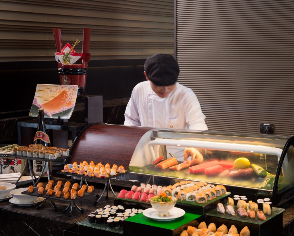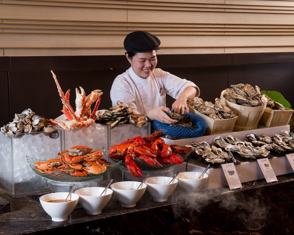 เชฟเจษฎณรงค์ ทักษาปกรณ์ หัวหน้าพ่อครัวประจำห้องอาหาร ได้คัดสรรอาหารนานาชาติน่ารับประทานหลากหลายรายการไว้ให้ทุกท่านเลือกรับประทานกันอย่างจุใจ เริ่มจากอาหารทะเล อาทิ ล็อบสเตอร์เนื้อแน่น ก้ามปูอลาสก้า ปูทะเล หอยตลับมะนิลา และหอยนางรมสดใหม่นำเข้าจากประเทศฝรั่งเศส ประเทศออสเตรเลีย และประเทศสหรัฐอเมริกา ส่วนมุมอาหารญี่ปุ่น มีทั้งปลาดิบสด ๆ ข้าวห่อสาหร่าย และข้าวหน้าปลาดิบ หลายชนิด ให้บริการ นอกจากนั้นยังมีพาสต้าเส้นสด อาหารไทยรสชาติจัดจ้าน ชีสคุณภาพดีนำเข้าจากหลายประเทศทั่วโลก ซี่โครงแกะย่าง และเนื้อสันนอกชั้นดีที่มีคะแนนไขมันแทรกอยู่ในเนื้อลายหินอ่อนระดับ 5 (marble score 5) ย่างสุกกำลังดี เป็ดปักกิ่งแสนอร่อยก็เป็นอีกหนึ่งเมนูอร่อยที่ไม่ควรพลาด นอกจากนี้ยังมีอาหารพิเศษที่เชฟจะปรุงใหม่แบบจานต่อจาน อาทิ ล็อบสเตอร์ย่าง ตับห่านย่าง เนื้อลูกวัวย่าง ปิดท้ายด้วยมุมขนมหวานหลากกหลายชนิด มีทั้งไอศครีมโฮมเมดใส่ในวาฟเฟิลที่ทำสดใหม่ หรือจะรับประทานกับเครปซูเซ็ท หรือช็อคโกแลตลาวาอบใหม่จานต่อจาน
