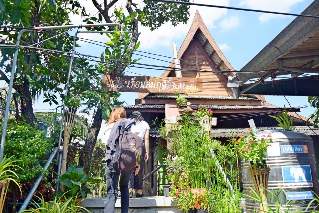 ด้านหลังของตลาดแห่งนี้ ยังมีบ้านไม้โบราณริมน้ำ ชื่อ เรือนสมฤดี อายุกว่าร้อยปี
