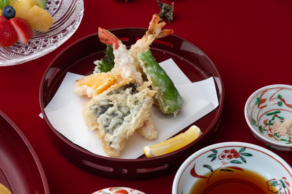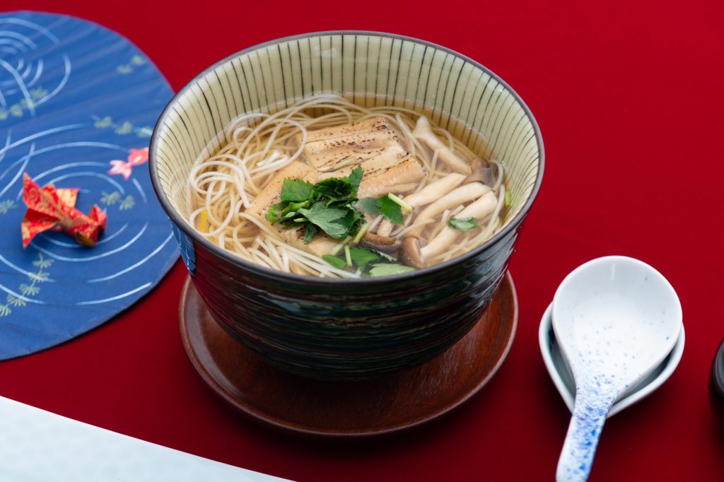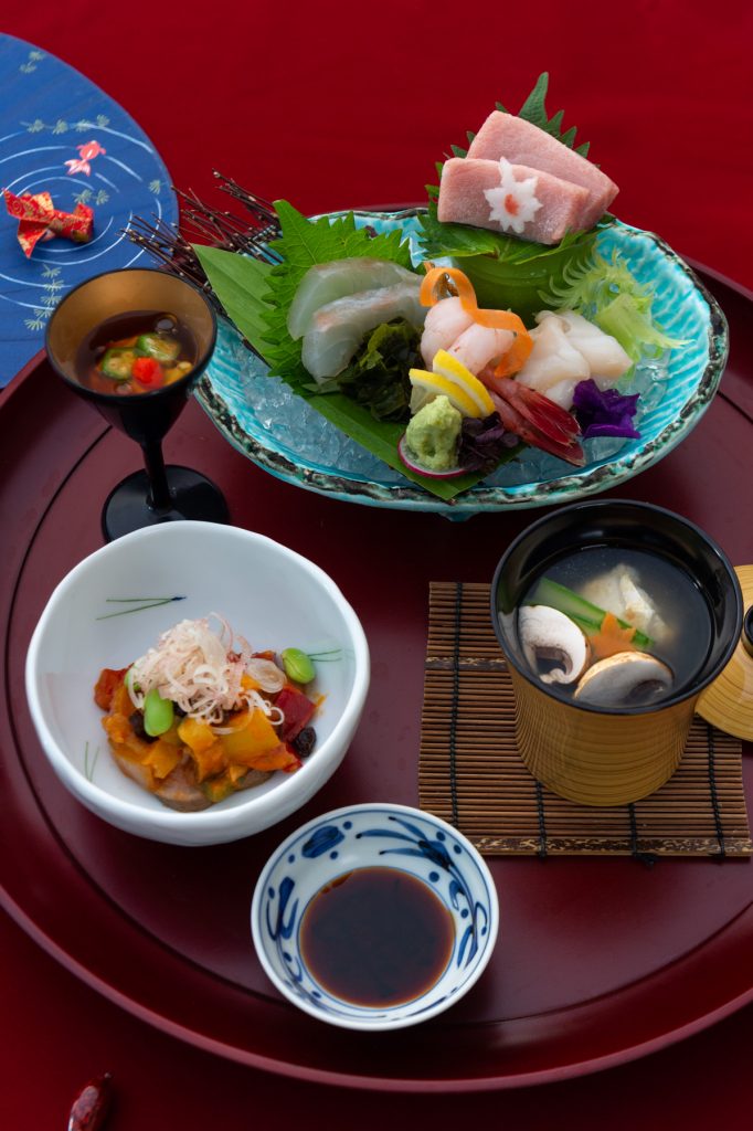 โดยอาหารชุดมื้อกลางวันประกอบไปด้วย มะเขือยาวผัดปรุงรสชาติด้วยซอสมะเขือเทศ เสิร์ฟพร้อมปลาหมึกยักษ์และกุ้งย่างตกแต่งด้วยถั่วแระญี่ปุ่น ซุปใสใส่กุ้งและเห็ดชิเมจิ ปลาดิบชั้นดี 3 ชนิด (ปลาทูน่า หอยปีกนก และปลาหางเหลือง) ปลากระพงญี่ปุ่นย่างราดซอสส้ม เป็ดและเผือกตุ๋นเสิร์ฟพร้อมแครอทและเจลลี่ซุปเนื้อวัว เทมปุระกุ้ง ปลาไหล และผักนานาชนิด ข้าวหน้าปลาไหลตุ๋นกับไข่ ส่วนขนมหวานเป็นมูสโยเกิร์ตราดถั่วแดงเชื่อม ให้บริการพร้อมผลไม้ตามฤดูกาล