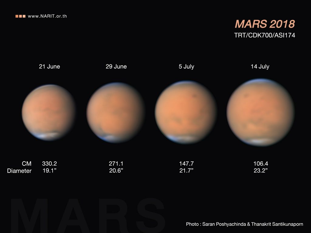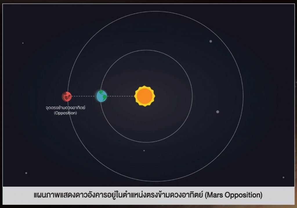 ดร.ศรัณย์ โปษยะจินดา ผู้อำนวยการสถาบันวิจัยดาราศาสตร์แห่งชาติ กล่าวว่า คืนวันที่ 27 กรกฎาคม 2561 เป็นช่วงเวลาที่เหมาะสมที่สุดในการสังเกตการณ์ดาวอังคาร ที่จะโคจรมาอยู่ในตำแหน่งตรงข้ามดวงอาทิตย์ อาทิตย์ หลังจากนั้นจะโคจรเข้าใกล้โลกเรื่อยๆ จนกระทั่งเข้าใกล้โลกที่สุดในวันที่ 31 กรกฎาคม 2561 ที่ระยะห่าง 57.6 ล้านกิโลเมตร จากระยะห่างเฉลี่ยประมาณ 225 ล้านกิโลเมตร เป็นการโคจรใกล้โลกที่สุดในรอบ 15 ปี นับตั้งแต่ปี 2546 ดาวอังคารจะสว่างมากและมีขนาดปรากฏใหญ่กว่าปกติ สังเกตเห็นได้หลังดวงอาทิตย์ตกลับขอบฟ้า ทางทิศตะวันออกเฉียงใต้ ตลอดทั้งคืนไปจนถึงรุ่งเช้าในวันถัดไป