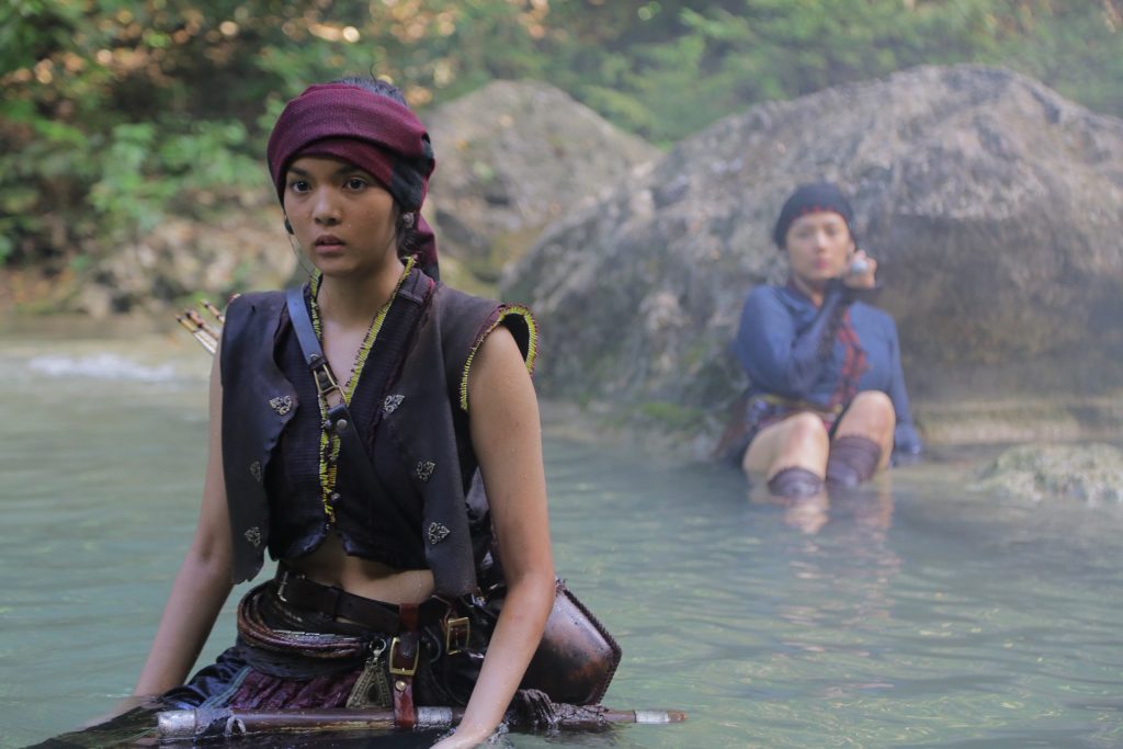 ฉากนี้ปักหลักถ่ายทำ ณ น้ำตกเอราวัณ ซึ่งถือว่าเบื้องหลังสาหัสเอาการ เพราะทีมงานต้องเดินเท้าขึ้นไปถึงน้ำตกชั้นที่เจ็ด พร้อมทั้งแบกอุปกรณ์การถ่ายทำไปเซ็ตใหญ่ โดยมีแมลงและอากาศที่ร้อนอบอ้าวมาเป็นอุปสรรค ก่อนเข้าฉากวิวและจิ๊บมีการซ้อมคิวบู๊กับกลุ่มครูฝึกที่แสดงเป็นเผ่านาคาอย่างแข็งขัน โดยสองสาวที่สวมบทนักรบหญิงแห่งเมืองคัง โชว์ลีลาทั้งศอก-เตะ-เข่า ได้อย่างทะมัดทะแมง จนทีมงานเก็บภาพสวยกินเวลาไปกว่าสองชั่วโมง