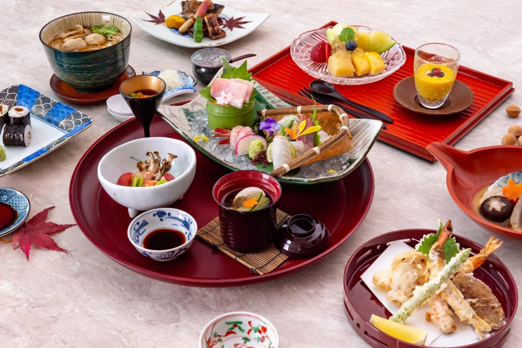 โดยอาหารชุดมื้ออาหารกลางวันมีอาหารน่ารับประทานได้แก่ ลูกพลับย่างรับประทานกับกุ้ง ปลาหมึก เห็ดไมทาเกะราดซอสน้ำส้มสายชูกับไข่แดง ซุปปลาแมคเคอเรล ใส่เห็ดชิเมจิ ปลาดิบชั้นดี 3 ชนิด (ปลาทูน่า ปลาหางเหลือง กุ้งหวาน)ปลากะพงขาวและเกาลัดย่างซอสมายองเนสผสมมิโซะ เนื้อปลาเข็มญี่ปุ่นบดตุ๋นกับเห็ดชิทาเกะ แครอท หัวไชเท้าและขิงเทมปุระกุ้ง ปลาเงินญี่ปุ่นและผักนานาชนิด บริการพร้อมข้าวญี่ปุ่นคลุกเคล้ากับเนื้อปลาแซลมอน โรยด้วยไข่ปลาแซลมอนใบโอบะ สาหร่ายทะเล และซุปมิโซะ ส่วนขนมหวานให้บริการเป็นพุดดิ้งรสเกาลัดญี่ปุ่น ราดซอสถั่วแดงและไข่แดง