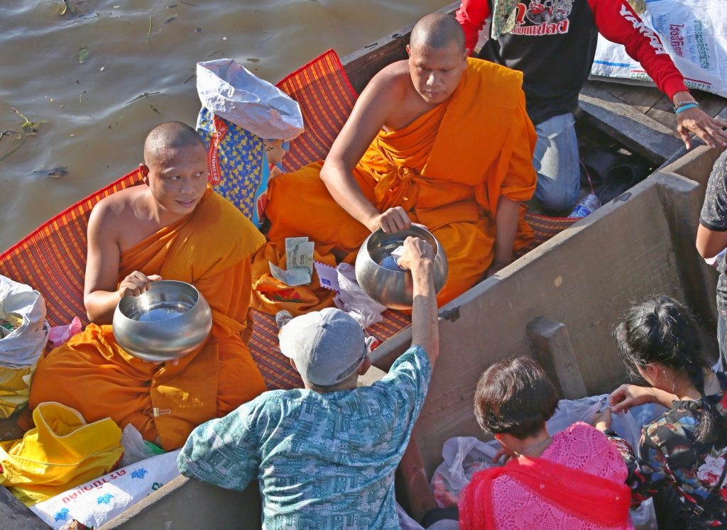 พิธีทำบุญตักบาตรในช่วงเช้าเริ่มตั้งแต่เวลา 06.00 น. โดยพระภิกษุจำนวน 100 รูป ลงเรือรับบิณฑบาตด้วยขบวนเรือมาดจำนวน 60 ลำ สิ่งที่ใช้สำหรับตักบาตรได้แก่ ดอกไม้ ธูปเทียน ข้าวสาร อาหารแห้ง ขนมแห้ง อาหารคาวหวาน ผลไม้ หรืออื่นๆ ตามจิตศรัทธา