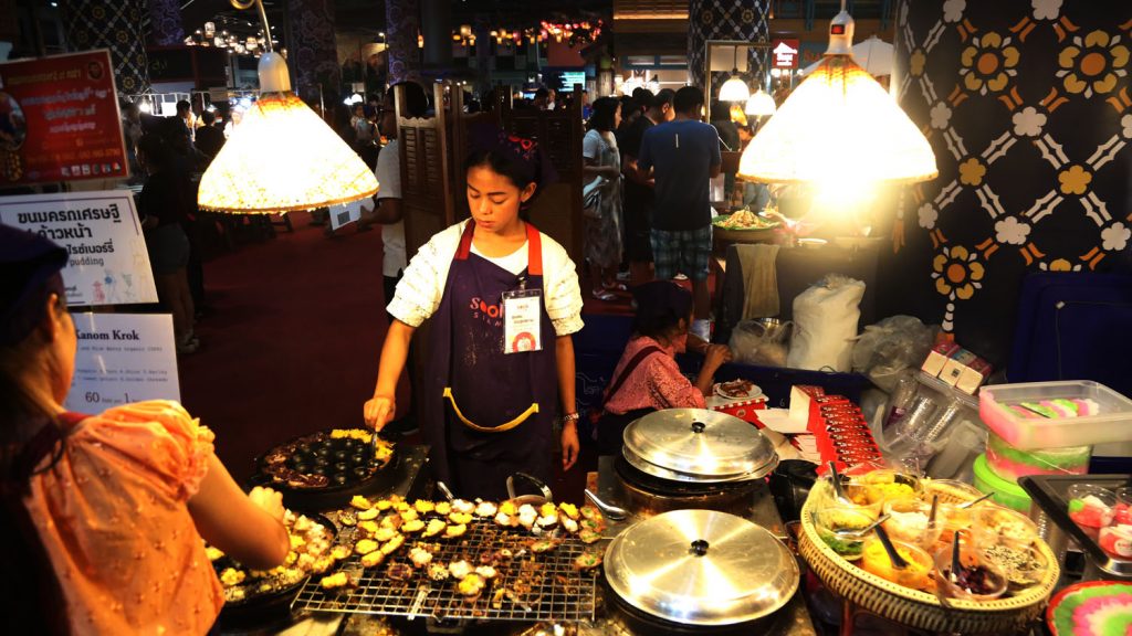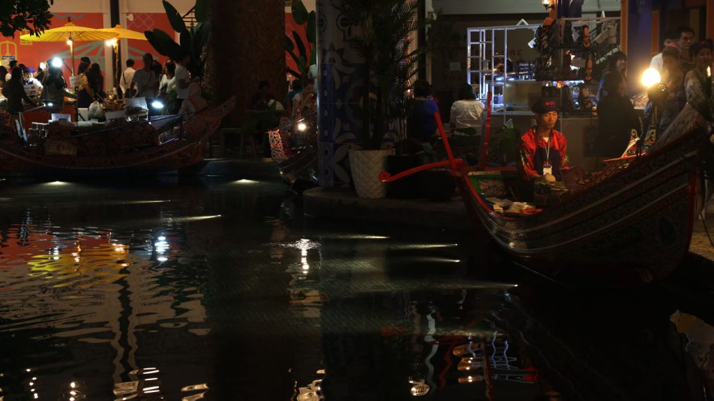 เดินเล่นข้างในหาอาหารแบบต้นตำหรับที่ดังมากมาย มีร้านจริงต้นตำรับดั้งเดิม มีจุดกำเนิดมาจากชุมชนท้องถิ่นทั่วไทย เป็นกิจการที่มีเรื่องราวความเป็นมาและเสน่ห์เฉพาะ ตั้งอยู่ในหมู่บ้านตามจังหวัดต่างๆ ซึ่งส่วนใหญ่เป็นร้านค้าของครอบครัวที่ดำเนินกิจการสืบต่อกันมาหลายรุ่น วันนี้ได้ยกกันมาอยู่ใน‘สุขสยาม’ให้เราเลือกชิม อร่อยทั้งนั้นเลย มีที่นั่ง ชิวๆริมน้ำ แม่ค้าพายเรือเอาของมาขาย จำลองได้เหมือนจริงมากๆ