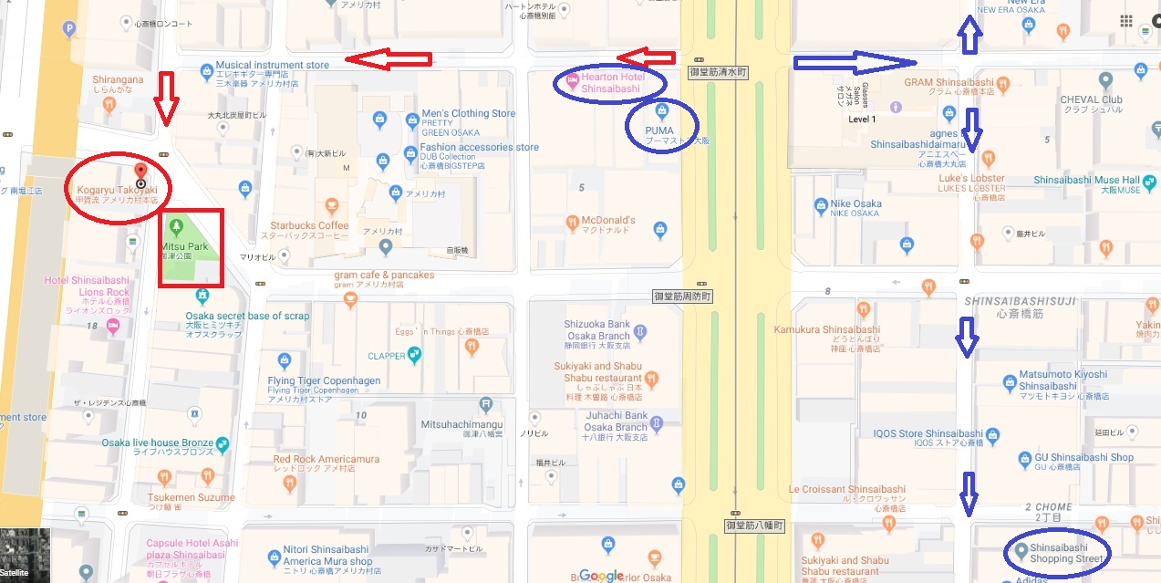 ต้องบอกก่อนว่า เราพักที่ Hearton Hotel Shinsaibashi ซึ่งอยู่ใกล้กับหมู่บ้านอเมริกา หรือ Amerikamura หรือที่ชาวญี่ปุ่นเรียกว่า อะเมะมุระ การเดินไปร้านโคกะริว ใช้เวลาไม่นาน แต่ก่อนถึงร้านทาโกะยากิ เราก็เดินสำรวจร้านรวงในสองข้างทางที่ผ่าน …สีสันข้างทาง ชวนช้อป