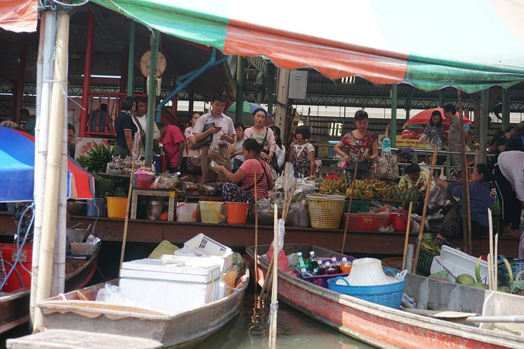 พ่อค้าแม่ค้านำสินค้ามาขายในบริเวณพื้นที่ของวัด ด้านริมคลอง มีทั้งผัก ผลไม้ อาหารคาวหวานมากมาย ล้วนนำมาจากท้องถิ่น ของที่ระลึกก็มีให้เลือกซื้อกลับเป็นของฝาก