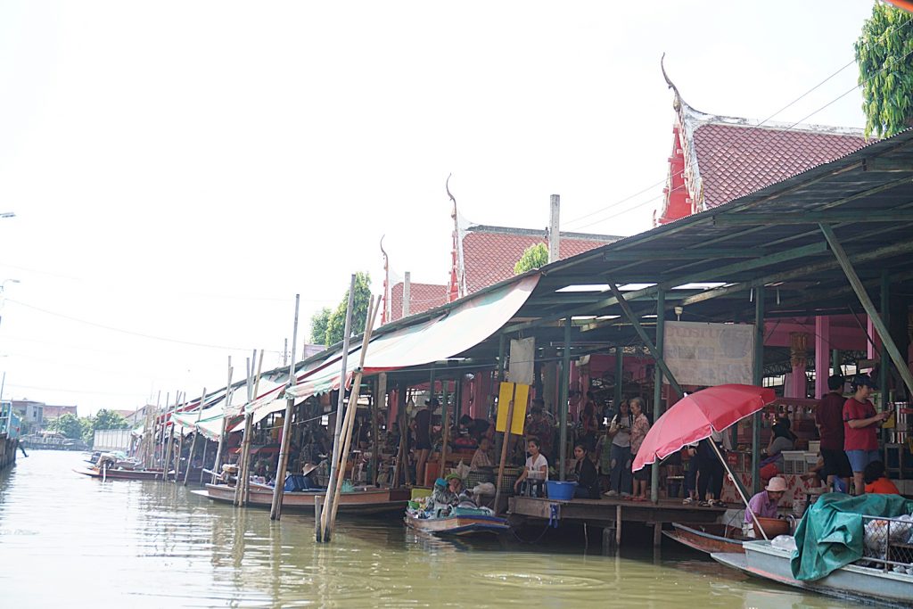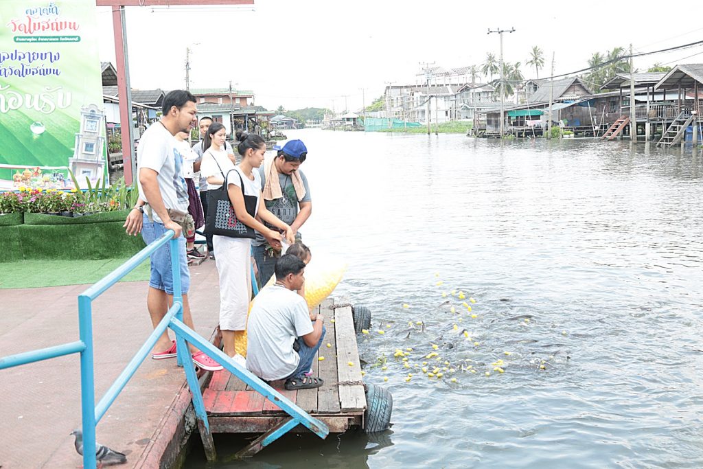 พ่อค้าแม่ค้านำสินค้ามาขายในบริเวณพื้นที่ของวัด ด้านริมคลอง มีทั้งผัก ผลไม้ อาหารคาวหวานมากมาย ล้วนนำมาจากท้องถิ่น ของที่ระลึกก็มีให้เลือกซื้อกลับเป็นของฝาก