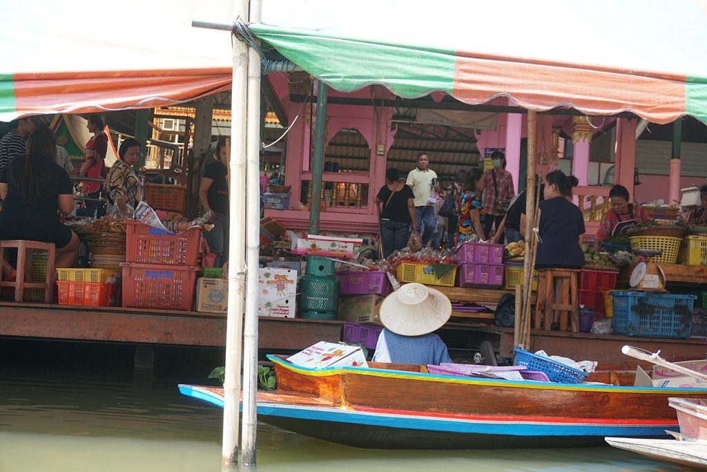 เราเดินทางถึงวัดตะเคียนเป็นจุดหมายแรก วัดนี้กว้างใหญ่ ที่จอดรถมากมาย บรรยากาศยามเช้าคึกคัก มีผัก ผลไม้ อาหารพื้นเมืองจากพ่อค้าแม่ขายในชุมชน ซึ่งเราเพียงมองผ่าน เพราะจะต้องนั่งเรือไปสถานที่สำคัญอันเป็นต้นทางในการล่องเรือ (ของพวกเรา)…ไปค่ะ
