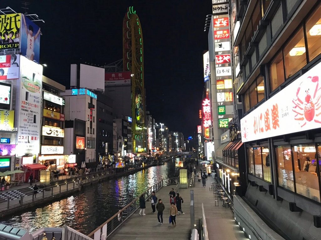 ถนนสายเล็กๆ ที่เต็มไปด้วยความคึกคักของแสงสีและผู้ค้น โดยเฉพาะบริเวณสะพานเอบิซุ สะพานข้ามคลองที่คึกคัก และแออัดด้วยผู้คนที่มาเช็คอิน ถ่ายภาพกับป้ายนีออนขนาดใหญ่ ป้ายนักวิ่งกูลิโกะ