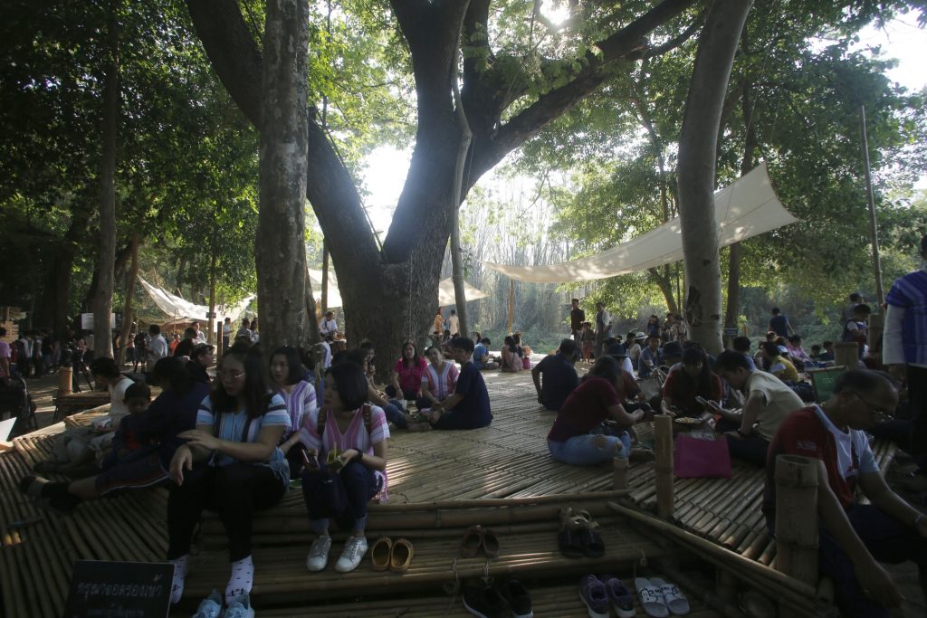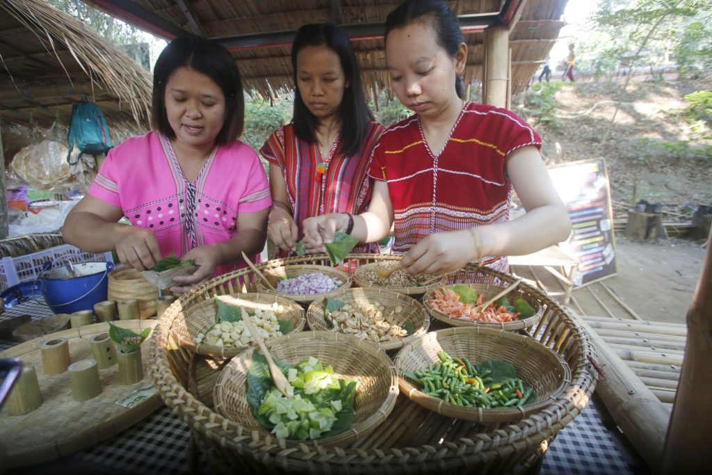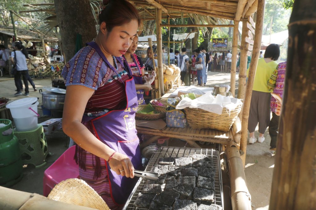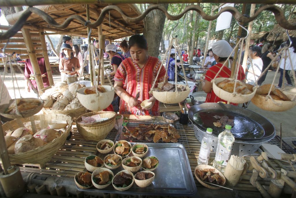 ขนมบ้าบิ่นมะพร้าว เนื้อบ้าบิ่นเหนียวนุ่ม หอมกลิ่นมะพร้าวมีทั้งทอดและแบบปิ้ง และยังมี อาหารเด็ดๆ อย่าง เมี่ยงถั่วดาวอินคา ข้าวยำสมุนไพรขนมปังฝรั่งเศส ขนมจีนน้ำยาหยวกกล้วย ข้าวห่อ ให้เราได้หามานั่งทาน บนแคร่ไม้ไผ่ หรือจะนั่งให้ห้อยขาข้างลำธารฟังเสียงเสียงน้ำไหลสบายอารมย์ก่อนกลับแวะช็อปของพื้นบ้าน อาทิผ้าทอพื้นเมืองเสื้อกระเหรี่ยง