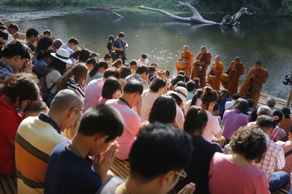 พระภิกษุสงฆ์ได้ฟื้นการออกบิณฑบาตเข้าเมื่อครั้งที่ชุมชนนี้การเดินทางยังไม่สะดวกเหมื่อนตอนนี้พระสงฆ์จะต้องอาศัยการถ่อแพออกมาโปรดญาติโยมที่อยู่ตามชุมชน ทำให้นักท่องเที่ยวที่ทราบข่าวต่างก็เดินทางมาสัมผัสวิถีชีวิตของชาวชุมชนกระเหรี่ยงจำนวนมาก ทำให้นักท่องเที่ยวแต่ละคนอยากตื่นเช้าเพื่อมารอใส่บาตรพระที่ล่องแพมารับบาตร โดยที่พระภิกษุสงฆ์จะออกมาบิณฑบาต จำนวน 5 รูป มีลูกบ้านถ่อเรือแล้วยังมี แบบถูกใจสายบุญ จุดที่พระล่องแพมาใส่บาตรนี้ ถ่ายรูปสวย นอกจากนี้ยังมีการทำบุญด้วยการรดน้ำต้นผึ้ง น้ำที่ตักจากลำธารลำภาชี เป็นธารน้ำศักดิ์สิทธิ์ที่ไหลจากทิศใต้สู่ทิศเหนือ รดน้ำต้นผึ้งมั่งมี และ ศรีสุข จากธารน้ำที่บริเวณริมธารหน้าวัดเพื่อความเป็นสิริมงคล