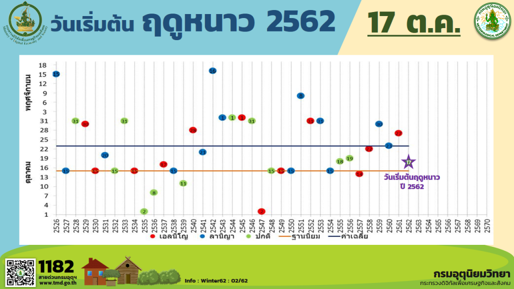 ประเทศไทยจะเริ่มเข้าสู่ฤดูหนาว ในวันที่ 17 ตุลาคม พ.ศ.2562 เนื่องจากอุณหภูมิต่่าสุดบริเวณประเทศไทยตอนบนจะลดลงอยู่ในเกณฑ์อากาศหนาวเย็นเกือบทั่วไปอย่างต่อเนื่อง ประกอบกับ ลมที่พัดปกคลุม บริเวณประเทศไทยในระดับล่างที่ความสูงประมาณ 100 เมตรถึงประมาณ 3,500 เมตร ได้เปลี่ยนเป็นลมตะวันออก เฉียงใต้หรือลมตะวันออก