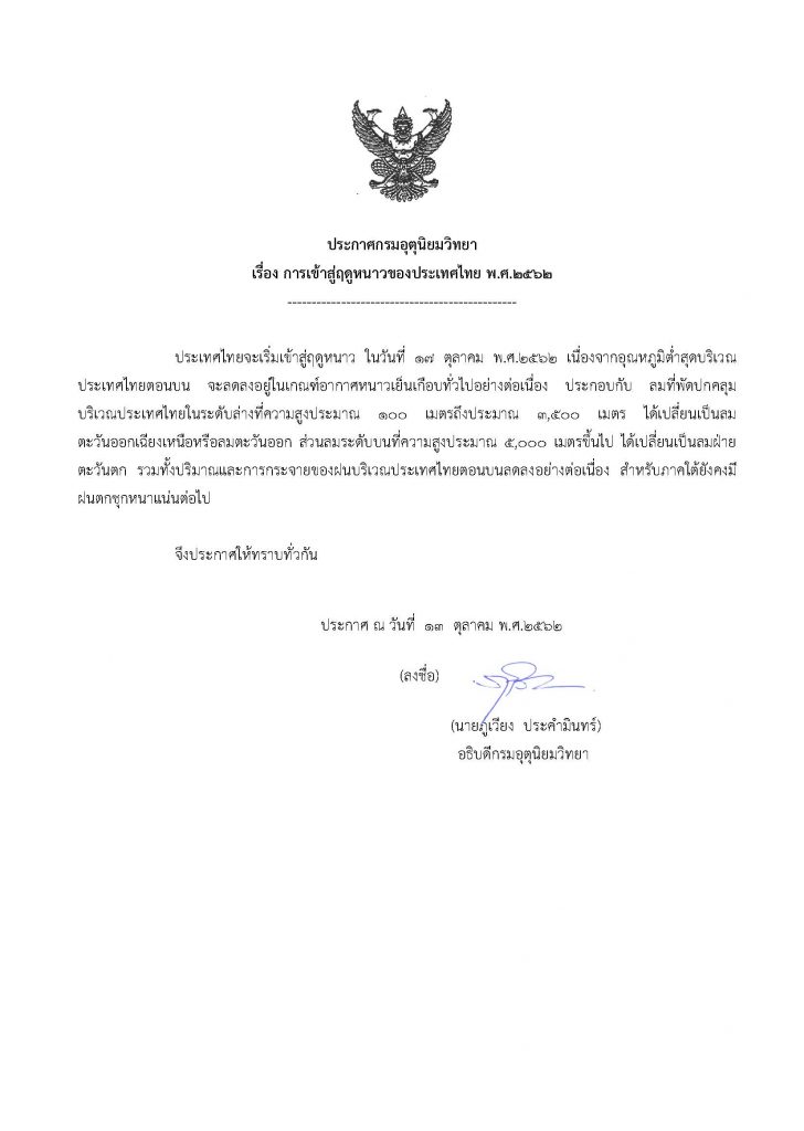 คิดจะพัก-เตรียมรื้อตูเสื้อผ้า หาเสื้อกันหนาวมาทำความสะอาดกันได้แล้วเพราะกรมอุตุนิยมวิทยา ออกประกาศ เรื่อง การเข้าสู่ฤดูหนาวของประเทศไทย พ.ศ.2562 ดังนี้
