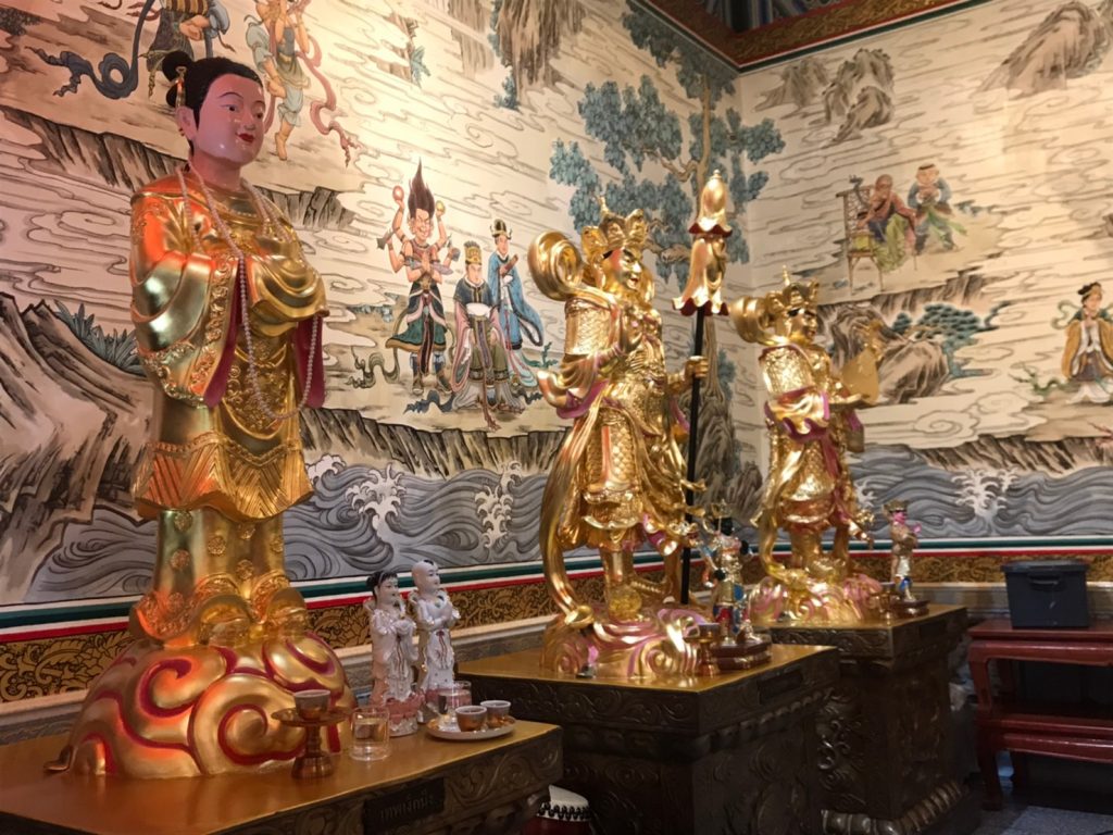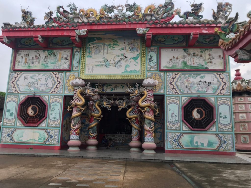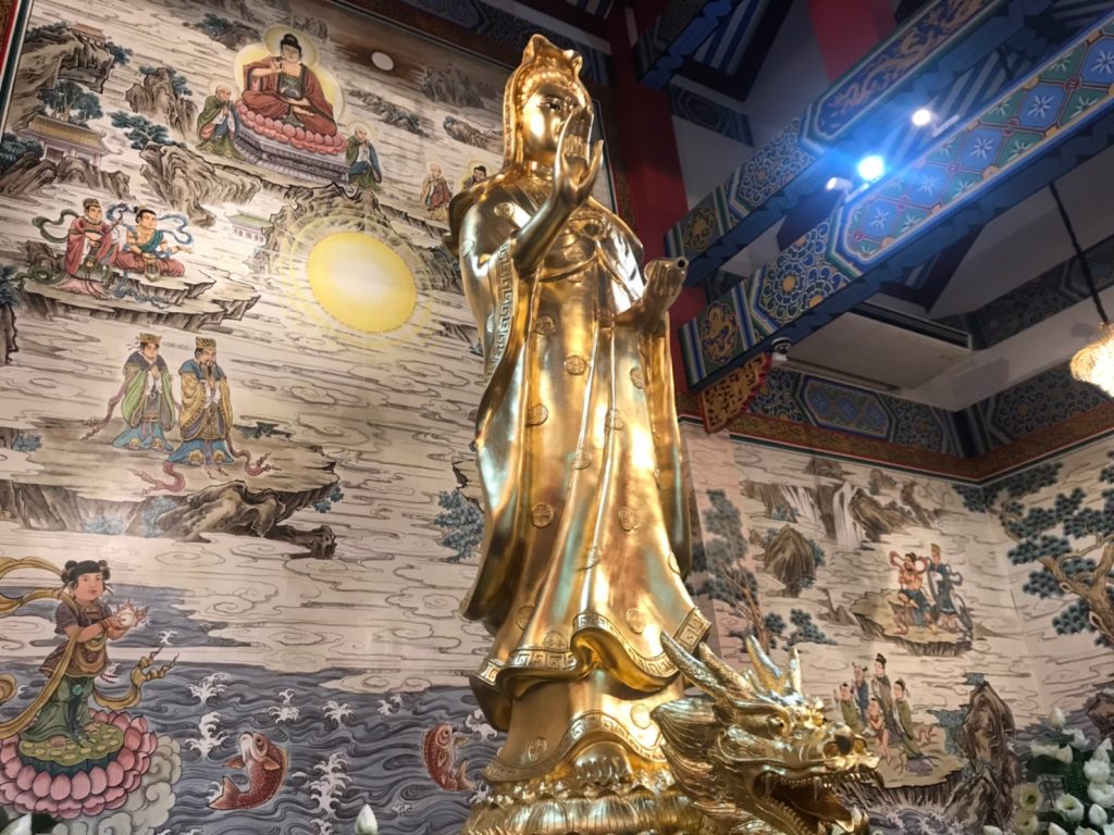 หลังจากขึ้นเรือที่ตลาดน้ำขวัญเรียม อิ่มอร่อยกับอาหารกลางวันกันแล้ว พวกเราก็เดินทางโดยรถตู้เพื่อเยี่ยมชมวิหารพระโพธิสัตว์กวนอิม สถาปัตยกรรมจีน ซึ่งสร้างขึ้นเพื่อเป็นที่ยึดเหนี่ยวจิตใจของชาวมีนบุรี และประชาชนทั่วไป ตั้งอยู่ในพื้นที่มูลนิธิกู้ภัยร่มไทร ภายในวิหารเป็นที่ประดิษฐานองค์เจ้าแม่กวนอิม มีภาพวาดเซียนตามฝาผนัง มีรูปปั้นมังกรที่เสาแต่ละต้น มีภาพแกะสลักหินจากจีนที่สวยงามมาก…ตื่นตา ตื่นใจ!