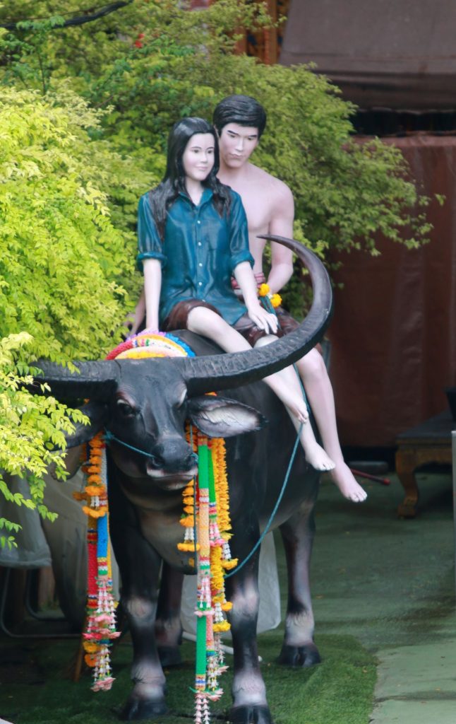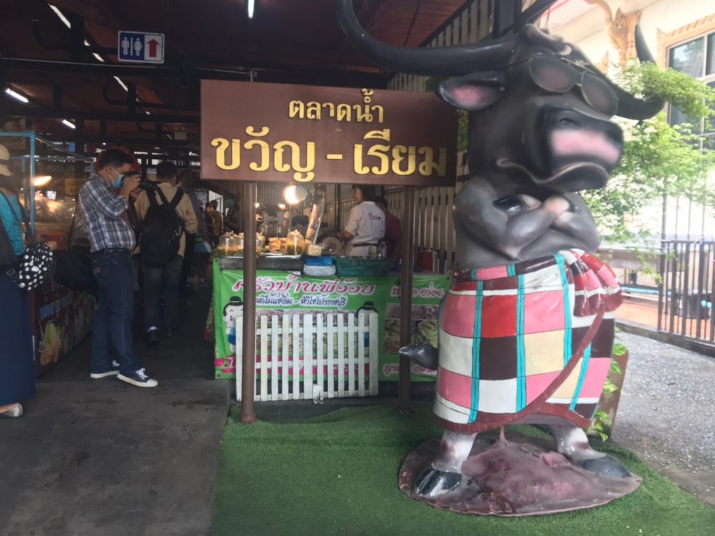 มองจากสะพานลงไป ด้านซ้ายมือมี “ศาลขวัญเรียม” ตั้งเด่นริมคลอง ซึ่งเล่าว่า ศาลแห่งนี้เดิมทีเป็นศาลเสาเดียวที่ลอยตามน้ำมา หลวงพ่อวัดบางเพ็งใต้ ได้อัญเชิญขึ้นมาประดิษฐานไว้ที่ริมคลองแห่งนี้ ครั้นเมื่อเปิดตลาดน้ำขึ้นมา ก็ได้ยกเสาขึ้นมาใหม่เป็นเสาสี่ต้น บริเวณศาลแห่งนี้มีรูปปั้นขวัญกับเรียม และควายที่ชื่อเรียวเพื่อนของขวัญ ให้นักท่องเที่ยวได้ชม และซึมซับเรื่องราวของตัวเอกจากอมตะนิยายรักชื่อดัง “แผลเก่า”… วิธีการไหว้ศาล คือ ใช้ดอกไม้ และธูป 9 ดวง (ขอได้ทุกเรื่อง… เขาว่าอย่างนั้น)