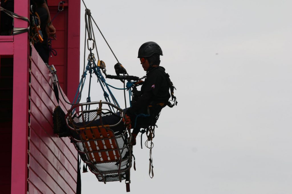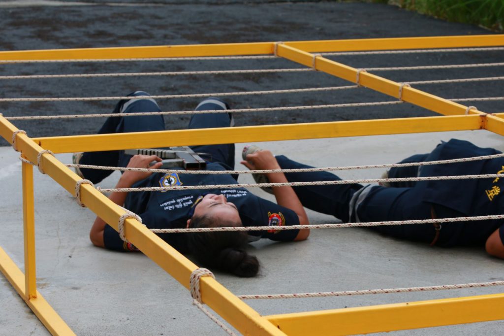 ชมสาธิตการโรยตัว โหนเชือก ข้ามกำแพง ซึ่งเป็นการฝึกช่วยเหลือตัวเองและผู้อื่นในภาวะฉุกเฉิน