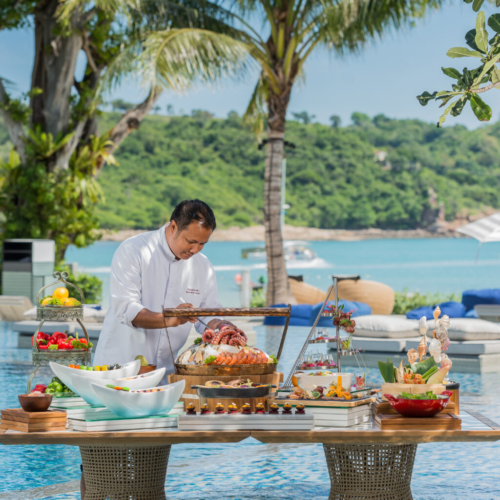 เชฟ อาซิซส์ กานดาร์ อะวัง (Azizskandar Awang) หัวหน้าพ่อครัวใหญ่เจ้าของรางวัลอันทรงเกียรติ Chef Hotelier of the Year จาก The HotelierAwards Asia และรางวัลอื่น ๆ อีกมากมายได้คัดสรรอาหารทะเลสด ๆที่ทุกคนชื่นชอบมาให้บริการ ได้แก่ หอยนางรมสดนำเข้าจากฝรั่งเศสอาหารทะเลท้องถิ่นสด ๆ อาทิ กุ้งลายเสือ ปู และหอยแมลงภู่จากทะเลเกาะสมุยเมนูอาหารที่พลาดไม่ได้ อาทิ เนื้อออสเตรเลียชั้นดีส่วนสะโพกย่างทาโก้เนื้อสไตล์เม็กซิกันตุ๋นเสิร์ฟกับซุปเนื้อ คอหมูย่าง