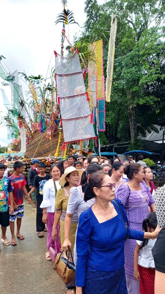 เมื่อถึงเช้าวันแรม 1 ค่ำ ชาวบ้านมารวมตัวกันตั้งเป็นขบวนแห่ มีปล่อยโคมลอยเล็กใหญ่ที่ช่วยกันทำขึ้นมา ประกอบการร้องรำทำเพลงอย่างสนุกสนาน จากนั้นชาวบ้านทั้งหมดจะช่วยกันลากเรือไปปล่อยกลางน้ำบริเวณจุดบรรจบของแม่น้ำสามสาย ได้แก่ ซองกาเลีย รันตี และบิคลี่ ที่เรียกกันว่า “สามสบ” หรือ “สามประสบ” นั่นเอง (ระยะทางที่ขบวนแห่ลากเรือจากบริเวณวัดวังวิเวกการามถึงแม่น้ำประมาณ 1.5 กม.)