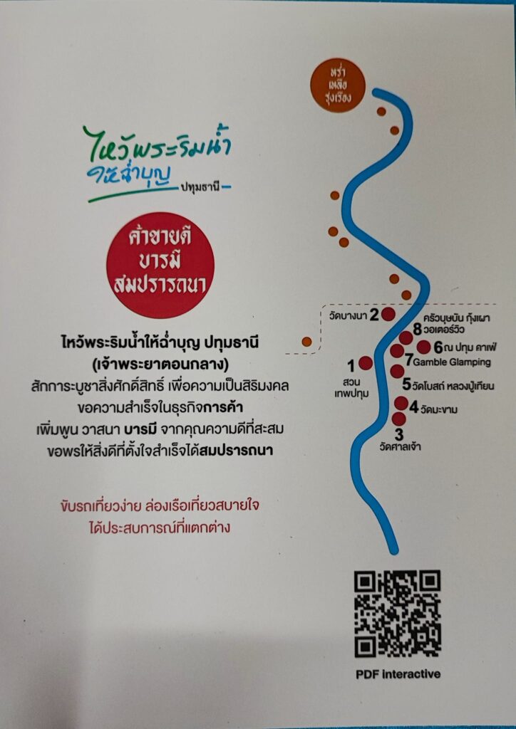 - เส้นทาง “ค้าขายดี บารมี สมปรารถนา” ชวนให้รู้จักกับวัดวาอาราม และสถานที่น่าสนใจ ริมสายนำ้เจ้าพระยาตอนกลางของปทุมธานี เป็นเส้นทางที่เหมาะต่อการนั่งเรือท่องเที่ยว เชื่อมโยงวัดต่างๆ เข้ากับตลาด ชุมชน ร้านอาหารอร่อย ริมน้ำ โดยมีแหล่งท่องเที่ยวที่น่าสนใจได้แก่