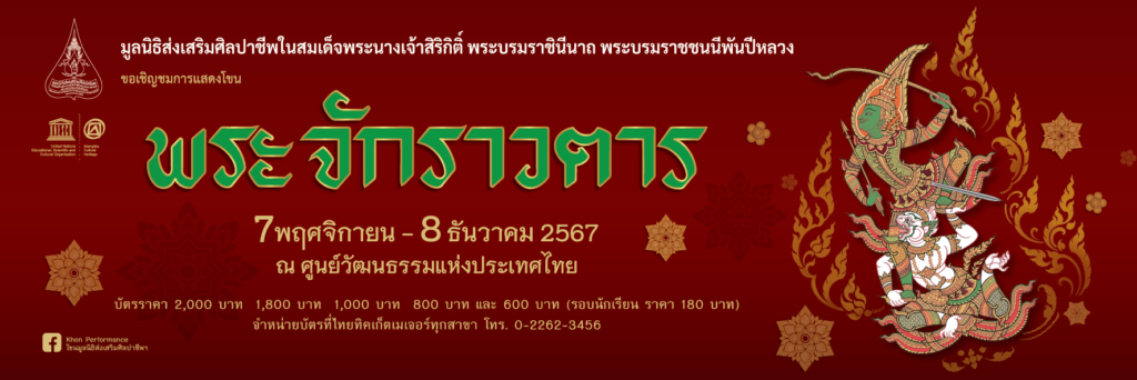 คิดจะพัก-มูลนิธิส่งเสริมศิลปาชีพ ในสมเด็จพระนางเจ้าสิริกิติ์ พระบรมราชินีนาถ พระบรมราชชนนีพันปีหลวง มีกำหนดจัดการแสดงโขนมูลนิธิส่งเสริมศิลปาชีพฯ เรื่องรามเกียรติ์ ตอน “พระจักราวตาร” ขึ้น ในระหว่างวันที่ 7 พฤศจิกายน – วันที่ 8 ธันวาคม 2567 ณ หอประชุมใหญ่ ศูนย์วัฒนธรรมแห่งประเทศไทย