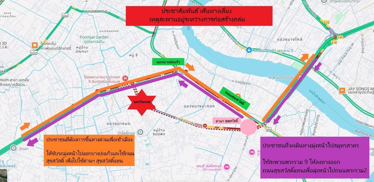 – กทพ. แจ้งปิดทางขึ้น – ลง ทางพิเศษเฉลิมมหานครชั่วคราว โดยประชาชนที่ต้องการใช้ทางพิเศษเข้าเมืองมุ่งหน้าไปแยกบางปะแก้ว และใช้ถนนสุขสวัสดิ์เพื่อไปใช้ด่านฯ สุขสวัสดิ์ ส่วนขาออกเมือง ให้ใช้สะพานพระราม 9 ลงสุขสวัสดิ์ มุ่งหน้าไปถนนพระราม 2