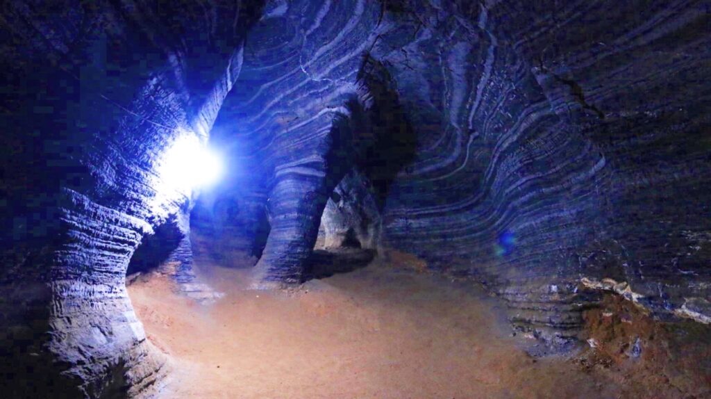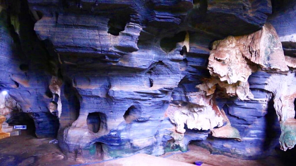 - สีสันผนังถ้ำอันน่าทึ่ง: หัวใจสำคัญของถ้ำแห่งนี้คือผนังถ้ำที่มีสีเทาอมฟ้า ซึ่งเป็นสีตามธรรมชาติ เมื่อมีแสงสว่างส่องกระทบจะทำให้เห็นความงามของริ้วลายได้อย่างชัดเจน เป็นจุดถ่ายรูปที่สวยงามและเป็นเอกลักษณ์อย่างมาก