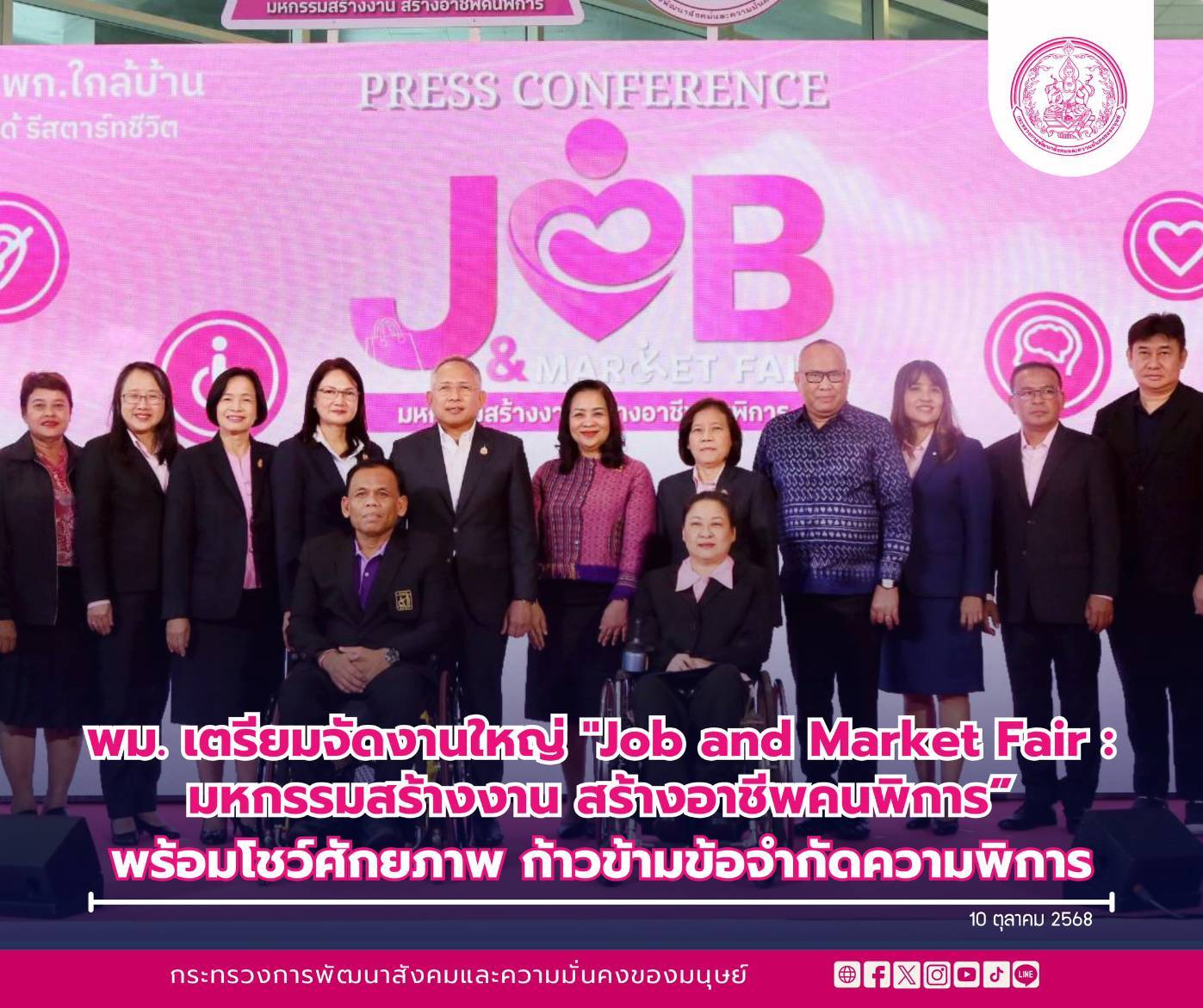 วันที่ 10 ตุลาคม 2568 เวลา 13.30 น. นายกันตพงศ์ รังษีสว่าง ปลัดกระทรวงการพัฒนาสังคมและความมั่นคงของมนุษย์  (ปลัด พม.) เป็นประธานงานแถลงข่าวการจัดงาน “Job and Market Fair : มหกรรมสร้างงาน สร้างอาชีพคนพิการ” ภายใต้นโยบาย “พม.ใกล้คุณ” โดย นายอัครา พรหมเผ่า รัฐมนตรีว่าการกระทรวงการพัฒนาสังคมและความมั่นคงของมนุษย์ (รมว.พม.) ซึ่งจัดโดยกรมส่งเสริมและพัฒนาคุณภาพชีวิตคนพิการ (พก.) กระทรวงการพัฒนาสังคมและความมั่นคงของมนุษย์ (พม.) ระหว่างวันที่ 20 – 21 ตุลาคม 2568 ณ อาคารรัฐประศาสนภักดี (อาคาร B) ศูนย์ราชการเฉลิมพระเกียรติ 80 พรรษาฯ กรุงเทพฯ เพื่อให้กลุ่มเปราะบางได้รับการช่วยเหลืออย่างเป็นระบบ ด้วยการเข้าถึงสิทธิประโยชน์ที่พึงมี และสามารถ “ตั้งหลักใหม่” เพื่อก้าวต่อไปอย่างมั่นคง โดยมี นางสาวสนธยา บุณยภูษิต อธิบดีกรมส่งเสริมและพัฒนาคุณภาพชีวิตคนพิการ พร้อมด้วย คณะผู้บริหารกระทรวง พม. คนพิการ ครอบครัวคนพิการ องค์กรคนพิการ อาสาสมัคร เครือข่ายเอกชน เข้าร่วมงานแถลงข่าว ณ บริเวณโถง ชั้น 1 อาคารกรมพัฒนาสังคมและสวัสดิการ สะพานขาว กรุงเทพฯ