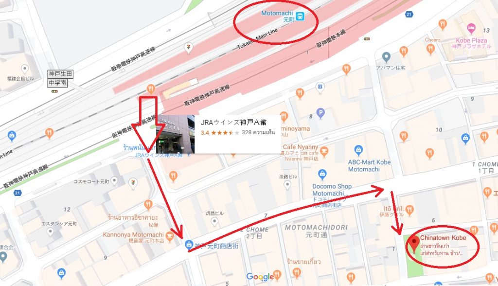 เราเดินทางจากโอซาก้า โดยรถไฟแบบธรรมดา (ไม่ใช่ JR) ถึงสถานี Motomachi ประมาณ 10.00 น. หลังจากนั้นก็เดินออกจากสถานี (ตามกูเกิลแมพ) เลี้ยวซ้าย ตรงไปไม่ไกล ก็ถึงอาคารหลังคาปิดสไตล์ตะวันตก หรือที่เรียกว่า ถนนสายช้อปปิ้ง Kobe Motomachi แล้วก็เลี้ยวไปทางซ้าย(ภายในถนนช้อปปิ้ง) เดินตรงไปอีกเล็กน้อย ก็ถึงทางเข้าโกเบไชน่าทาวน์ ซึ่งอยู่ทางขวามือ (ระยะทางโดยรวมจากสถานีรถไฟ เดินไปไชน่าทาวน์ ประมาณ 450 เมตร)